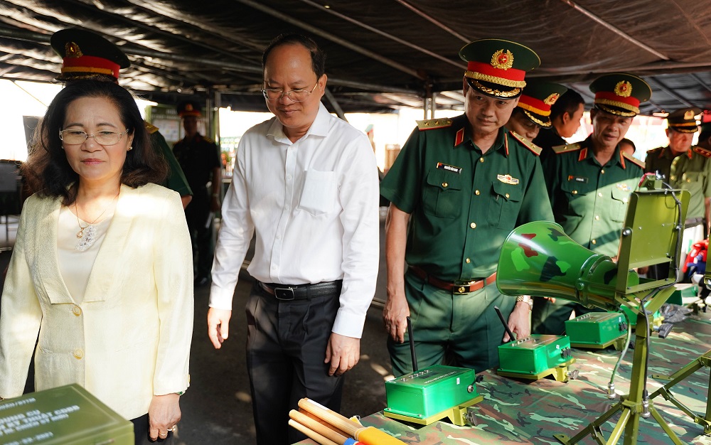 Lãnh đạo Thành ủy, HĐND, UBND TP Hồ Chí Minh thăm gian hàng trưng bày trang thiết bị diễn tập, huấn luyện.