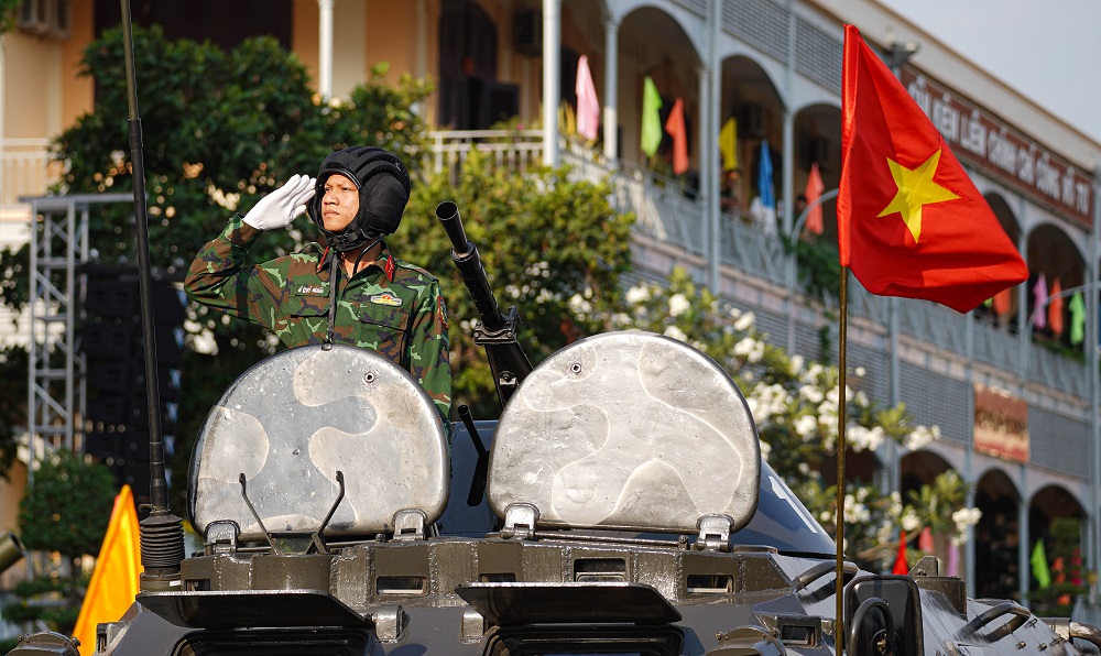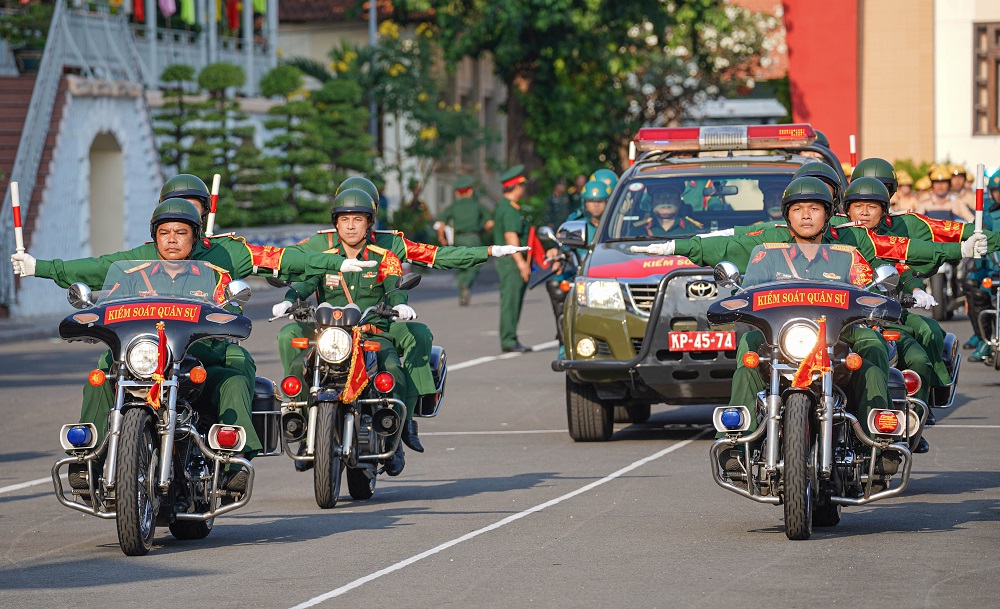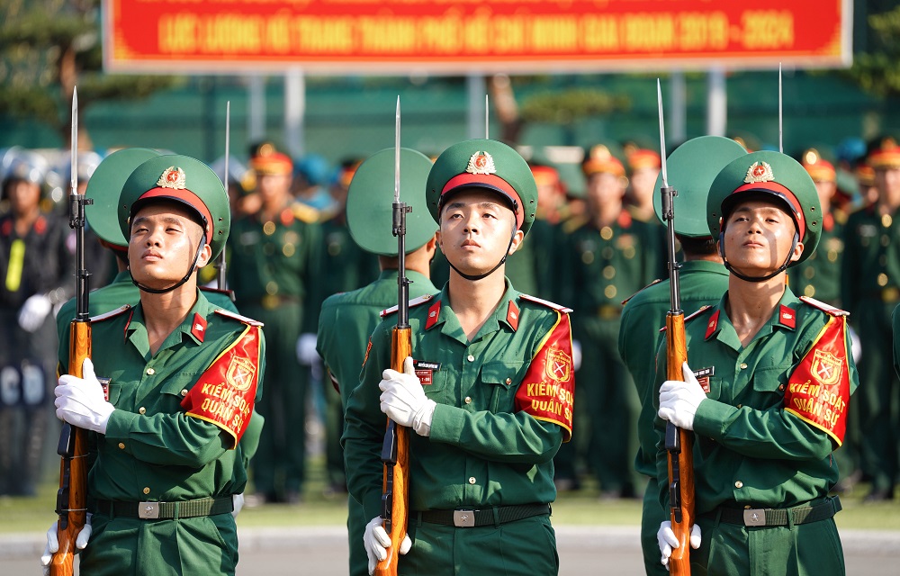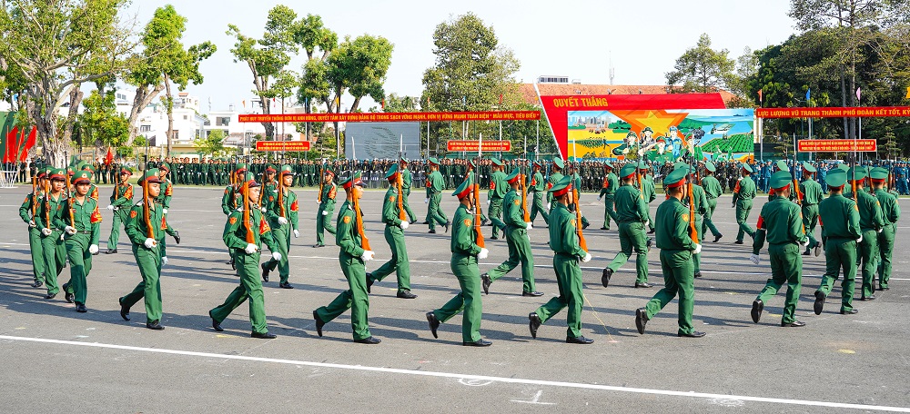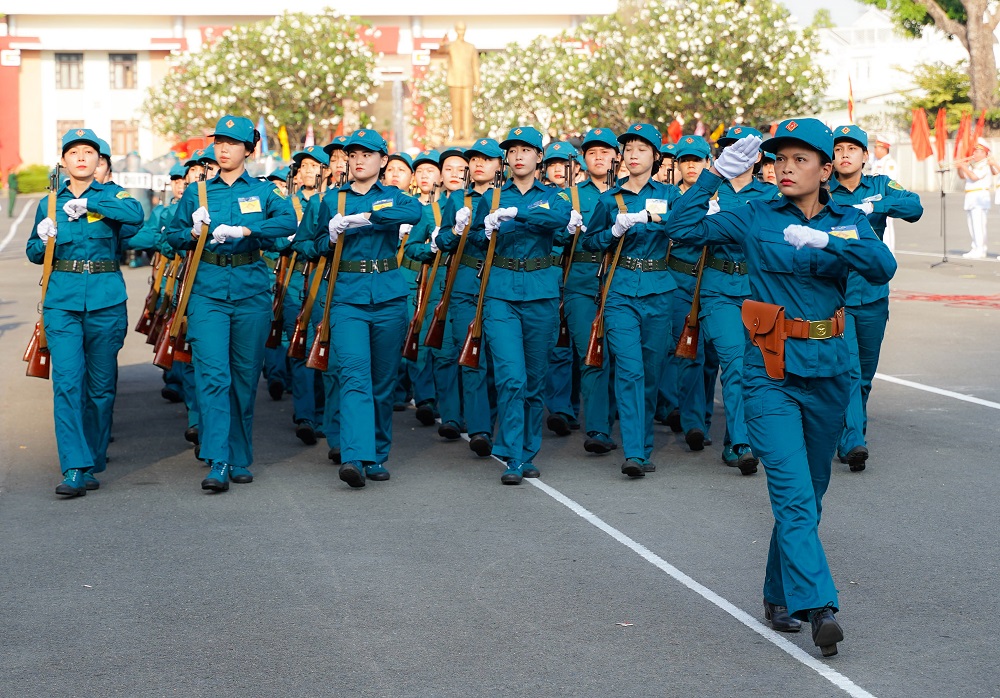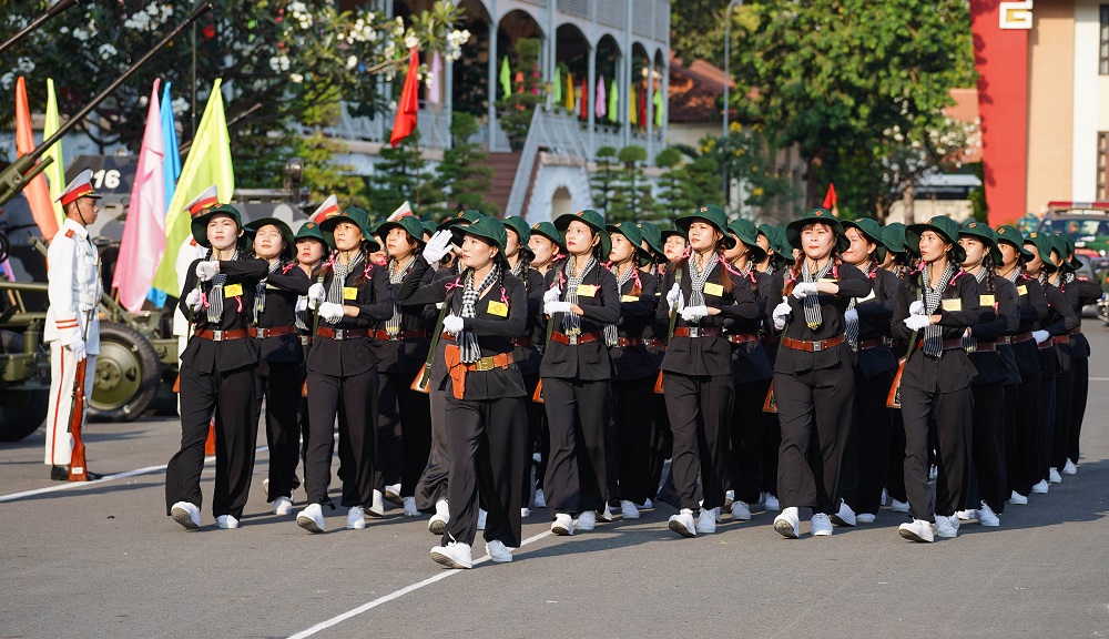 Các chiến sĩ Khối đội ngũ Tiểu đoàn vệ binh – Kiểm soát quân sự, nữ dân quân tự vệ, nam dân quân thường trực... tham gia duyệt binh.