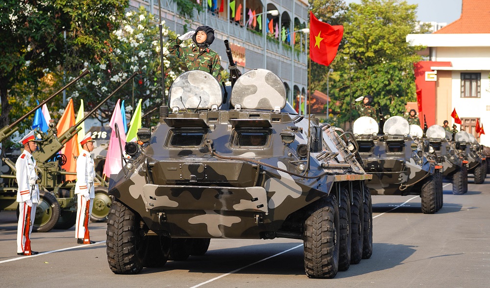 Các chiến sĩ khối Lực lượng Tiểu đoàn Vệ binh- Kiểm soát Quân sự, Cảnh sát giao thông (Công an TP Hồ Chí Minh), Khối xe Thiết giáp của Tiểu đoàn Tăng Thiết giáp diễu binh cùng phương tiện đặc chủng.