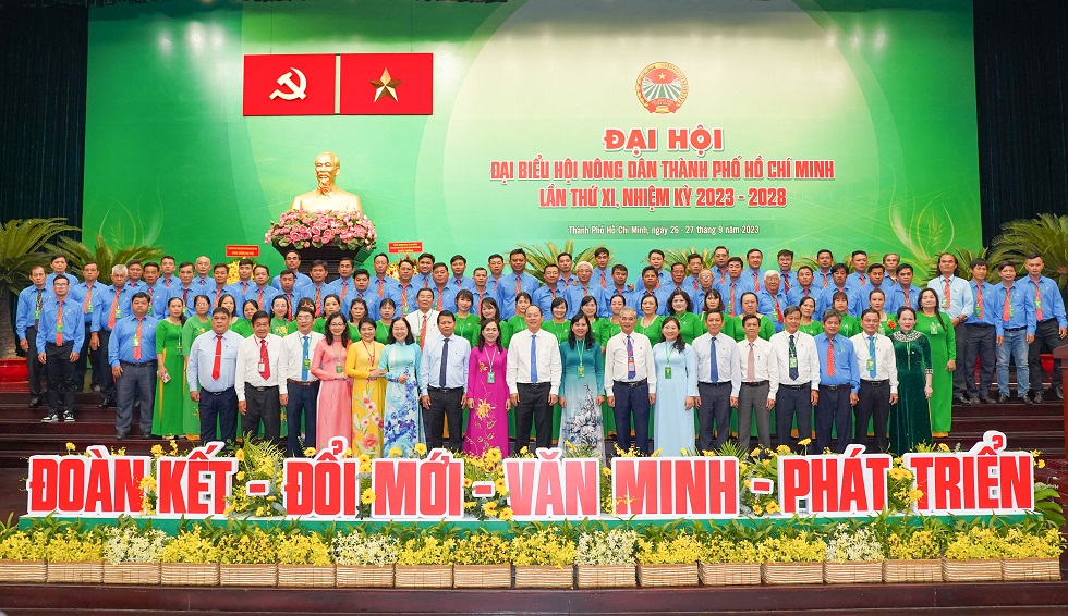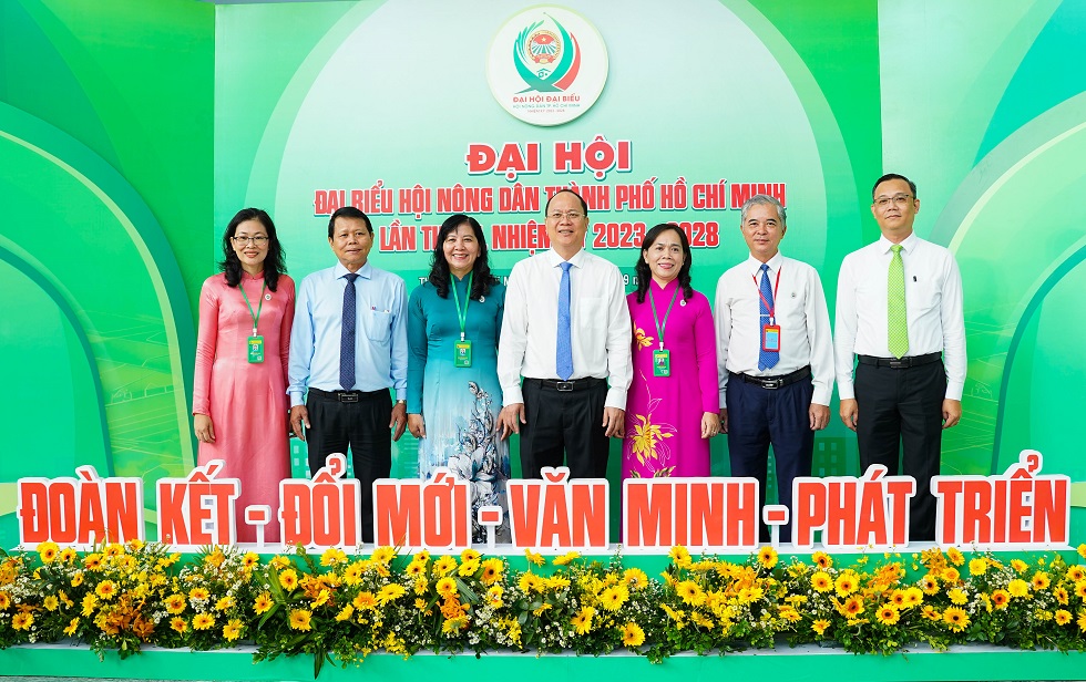 Lãnh đạo Trung ương Hội Nông dân Việt Nam, TP Hồ Chí Minh chụp ảnh lưu niệm, tặng hoa chúc mừng đến Ban chấp hành Hội Nông dân Thành phố.