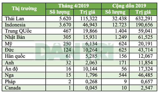 Với 5.620 xe nhập khẩu vào Việt Nam trong tháng 4/2019, Thái Lan chiếm tới 51,7%, trong khi Indonesia cũng không kém, với 3.670 xe nhập khẩu vào Việt Nam, chiếm tỉ trọng 33,7%. Trong khi đó, tính từ đâu năm 2019, số lượng xe nhập khẩu vào Việt Nam từ Thái Lan chiếm 64% và từ Indonesia chiếm 25,1%.