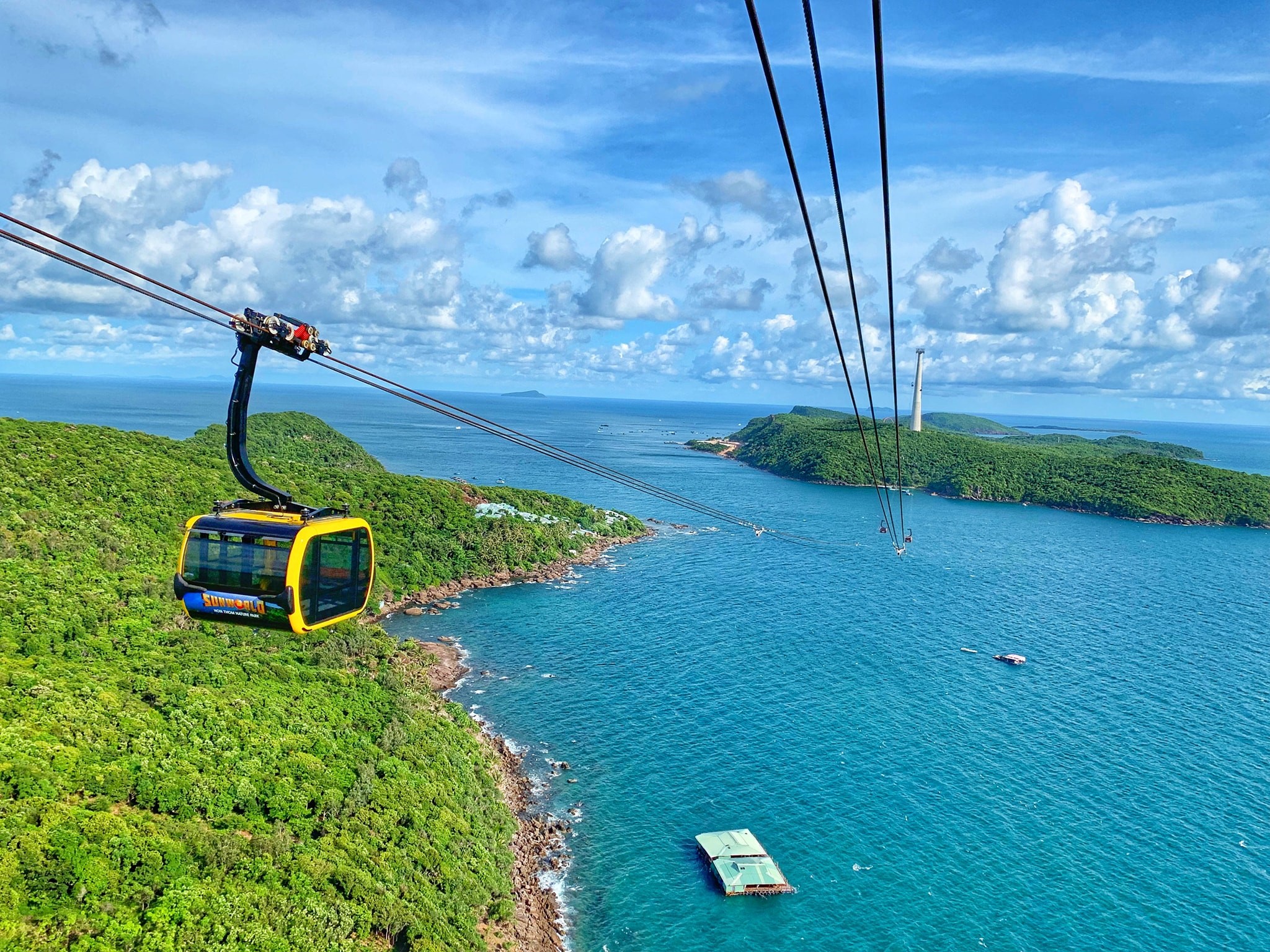 Để đến thiên đường mới nổi này, du khách chỉ mất 15 phút đồng hồ ngồi trong ca bin cáp treo, vượt chặng đường dài 7,9 km xuất phát từ trung tâm thị trấn An Thới (Phú Quốc), vượt qua Hòn Dừa, Hòn Rỏi ra tới Hòn Thơm, thu vào tầm mắt quang cảnh biển đảo đẹp như chốn thần tiên từ trên cao.