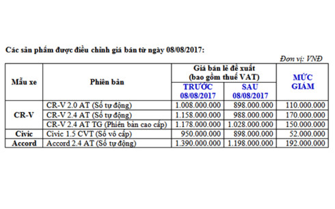 Từ đầu năm 2017, toàn thị trường có dấu hiệu chững lại do tâm lý chờ đợi của khách hàng để mua xe với mức giá tốt hơn vào năm 2018. Mong muốn khách hàng có thể sở hữu ngay các mẫu xe yêu thích với tính thực dụng cao, cảm giác lái vượt trội, tính năng an toàn hàng đầu và mức giá hợp lý; đồng thời gia tăng “niềm vui cầm lái” các mẫu xe mang thương hiệu Honda cho nhiều khách hàng hơn nữa, từ ngày 8/8/2017, Honda Việt Nam (HVN) điều chỉnh giá bán lẻ đề xuất cho 3 mẫu xe Honda CR-V, Honda Civic và Honda Accord.