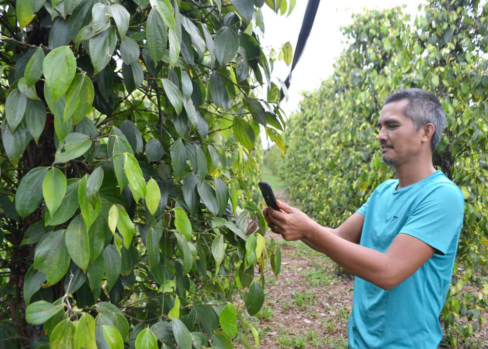 Ông Nguyễn Tấn Công-Chủ tịch HĐQT HTX Nông nghiệp và Dịch vụ Nam Yang kiểm tra vườn hồ tiêu hữu cơ. (Ảnh: Báo Gia Gia