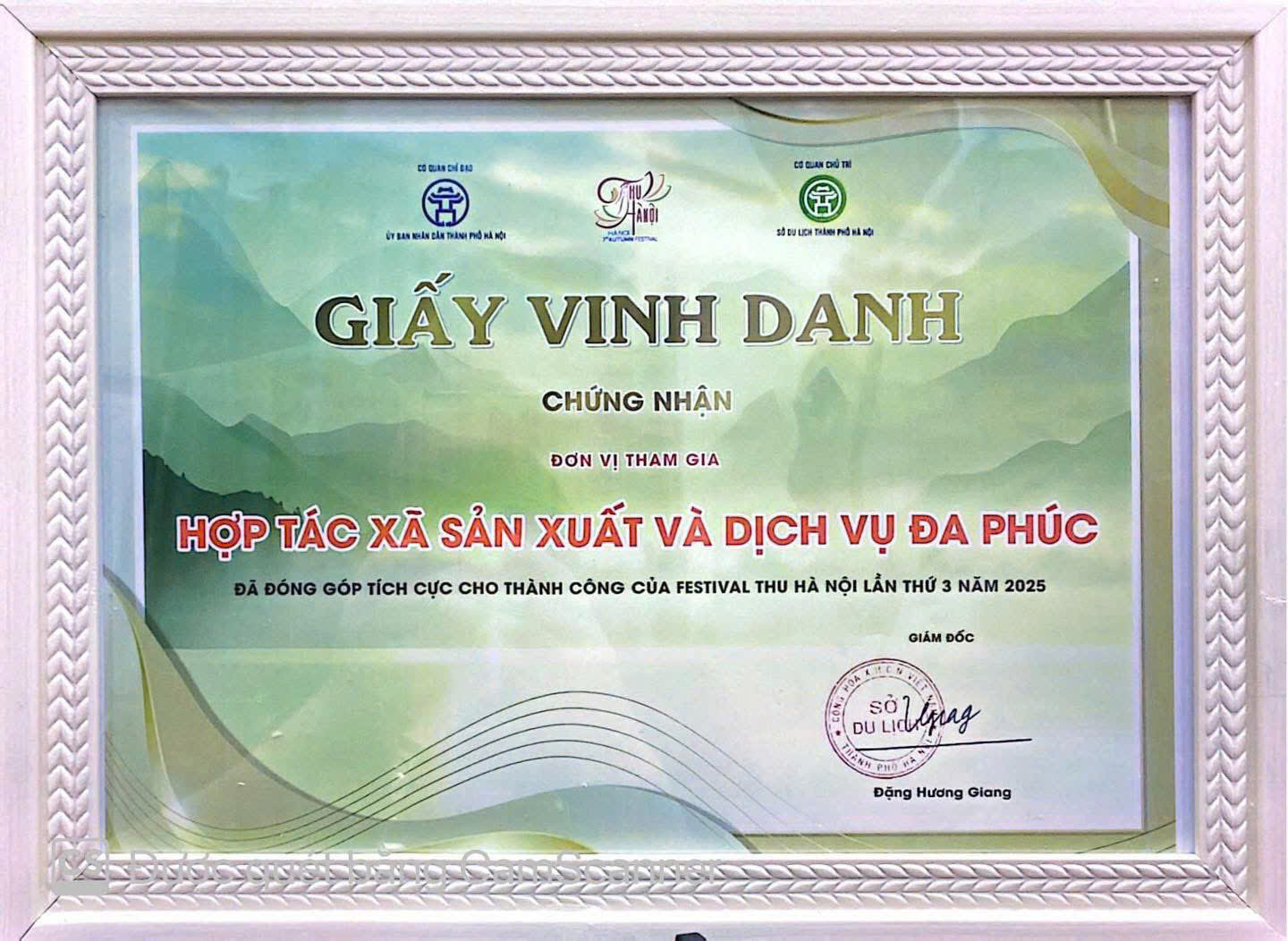 Giấy vinh danh là minh chứng rõ nét cho những đóng góp tích cực của HTX Đa Phúc tại Festival Thu Hà Nội lần thứ 3 năm 2025, ghi nhận sức lan tỏa của đặc sản địa phương tại Thủ đô.