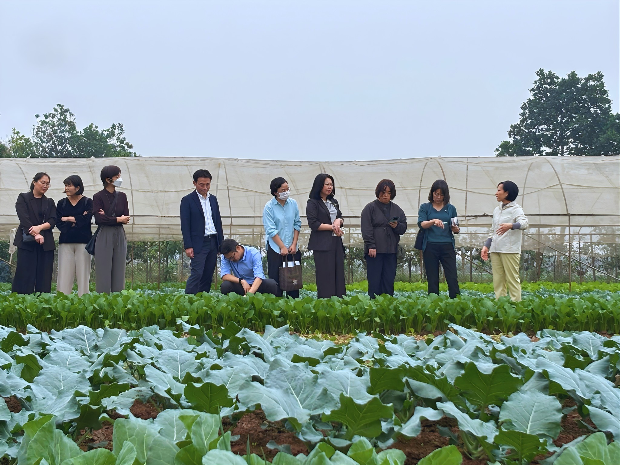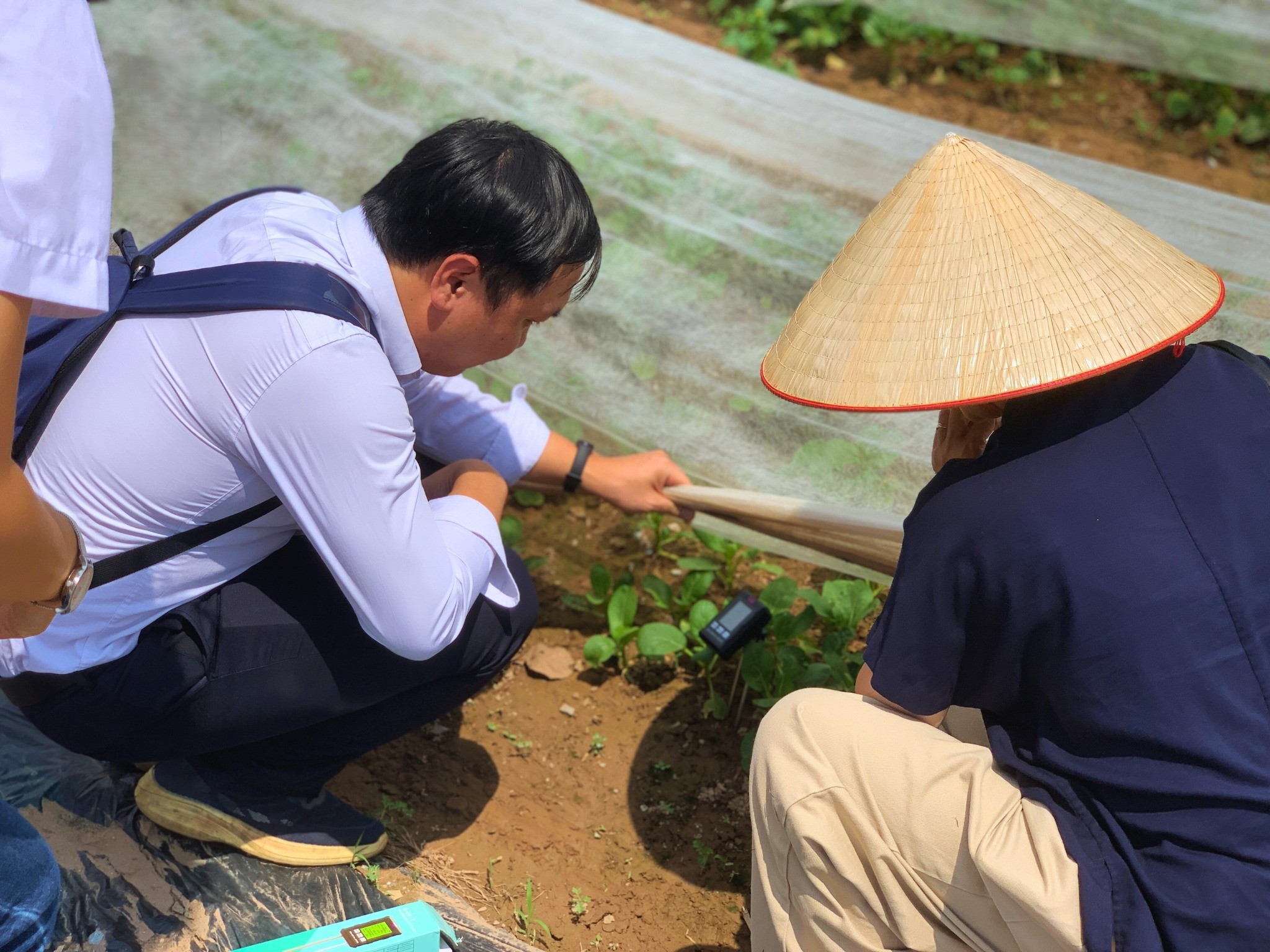 Các chuyên gia và đối tác kiểm tra phương pháp trồng rau theo quy trình VietGAP tại HTX rau quả sạch Chúc Sơn.