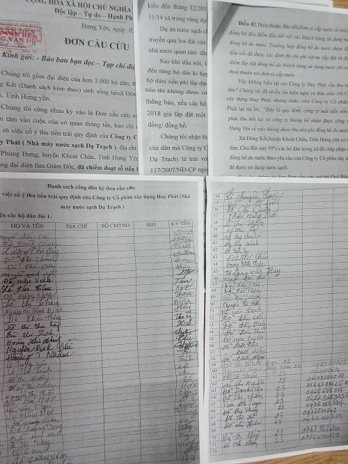 Trong đơn Cầu cứu, đại diện các hộ dân cư đã viết: “Chúng tôi nhận thấy hành vi thu tiền phí lắp đặt đồng hồ nước sạch của dân mà Công ty Cổ phần xây dựng Huy Phát (Nhà máy nước sạch Dạ Trạch) là trái với quy định được quy định trong Nghị định số 117/2007/NĐ-CP ngày 11/7/2007 của Chính phủ về sản xuất, cung cấp và tiêu thụ nước sạch.