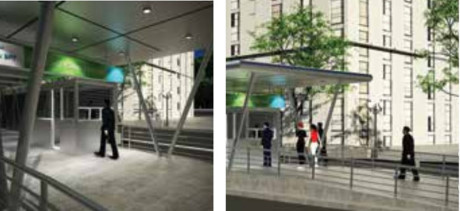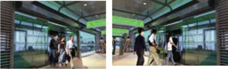 Khi đến dải phân cách, hành khách tiếp tục di chuyển qua đường dẫn vào nhà chờ BRT. Đường dẫn có cấu trúc dài, thoải và có dải dẫn đường, thuận tiện cho cả người cao tuổi, người khiếm thị và người sử dụng xe lăn.