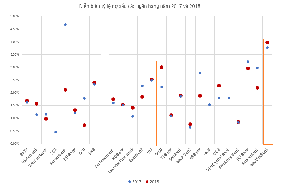 Với MSB (tên mới của Martitime Bank), ngân hàng cũng có tỷ lệ nợ xấu hơn 2% ổn định trong vài năm trước nhưng đã bất ngờ tăng lên mức 3% trong năm 2018 với quy mô nợ có khả năng mất vốn tăng gấp đôi từ 640 tỷ đồng lên 1.242 tỷ đồng.