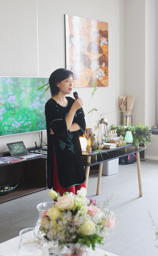 Đạo diễn Nguyễn Hoàng Điệp hướng dẫn các chị em chăm sóc bản thân tốt hơn nhờ sử dụng tinh dầu. (Ảnh: BTC)