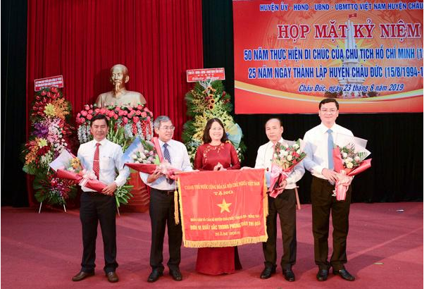 Ngày 23/8, Huyện ủy, HĐND, UBND, UBMTTQVN huyện Châu Đức tổ chức Họp mặt Kỷ niệm 50 năm thực hiện Di chúc của Chủ tịch Hồ Chí Minh (1969-2019) và 25 năm ngày thành lập huyện Châu Đức (15/8/1994-15/8/2019).