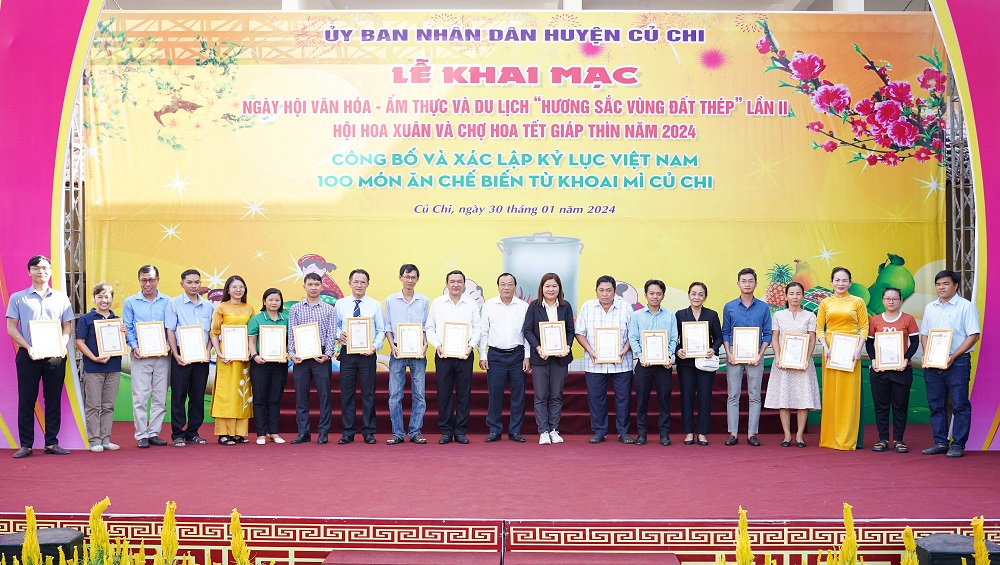 Dịp này, UBND huyện Củ Chi đã nhận bằng công nhận kỷ lục 100 món ăn từ khoai mì do Tổ chức Kỷ lục Việt Nam (VietKings) xác nhận. Khoai mì hay người dân huyện Củ Chi thường gọi là Củ mì từ xa xưa đã rất quen thuộc trong bữa ăn hàng ngày và đặc biệt trong thời kỳ kháng chiến. Củ mì gần như là thức ăn đảm bảo cho sự sống của quân và dân Củ Chi dưới những đường hầm địa đạo. Qua sự sáng tạo của người dân.