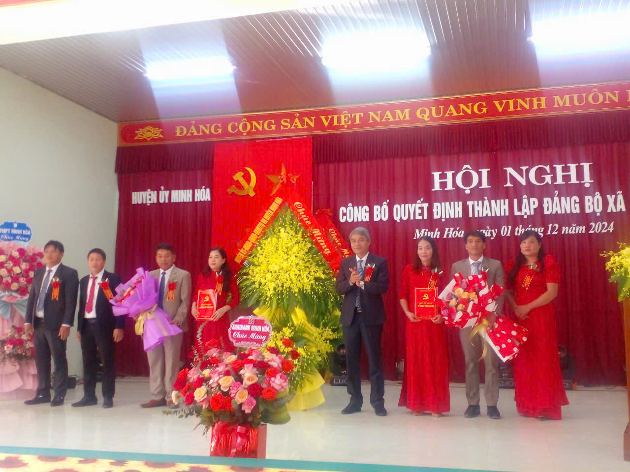 Lãnh đạo huyện Minh Hóa trao quyết định và tặng hoa chúc mừng Đảng bộ xã Tân Thành