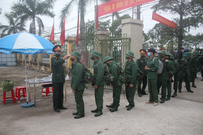 Các tân binh được đội ngũ quân y, bác sĩ đo thân nhiệt phòng tránh dịch bệnh Covid-19 trước lúc lên xe khởi hành.