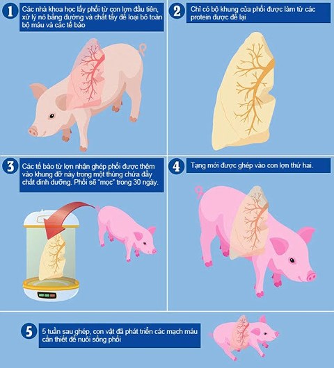 Để làm được điều này, họ sử dụng tế bào phổi từ những con lợn không có trong nghiên cứu để làm khung đỡ, hay hình dạng cơ bản của phổi mới và sau đó sử dụng các tế bào từ mỗi con trong 4 con vật trong nghiên cứu để nuôi cấy phổi mới phù hợp hoàn hảo với chính chúng.