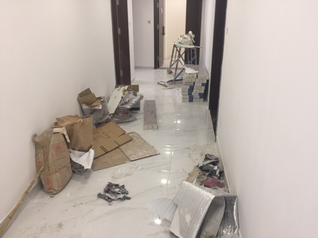 Rác thải, nguyên vật liệu ngổn ngang tại hành lang như một công trường đang xây dựng