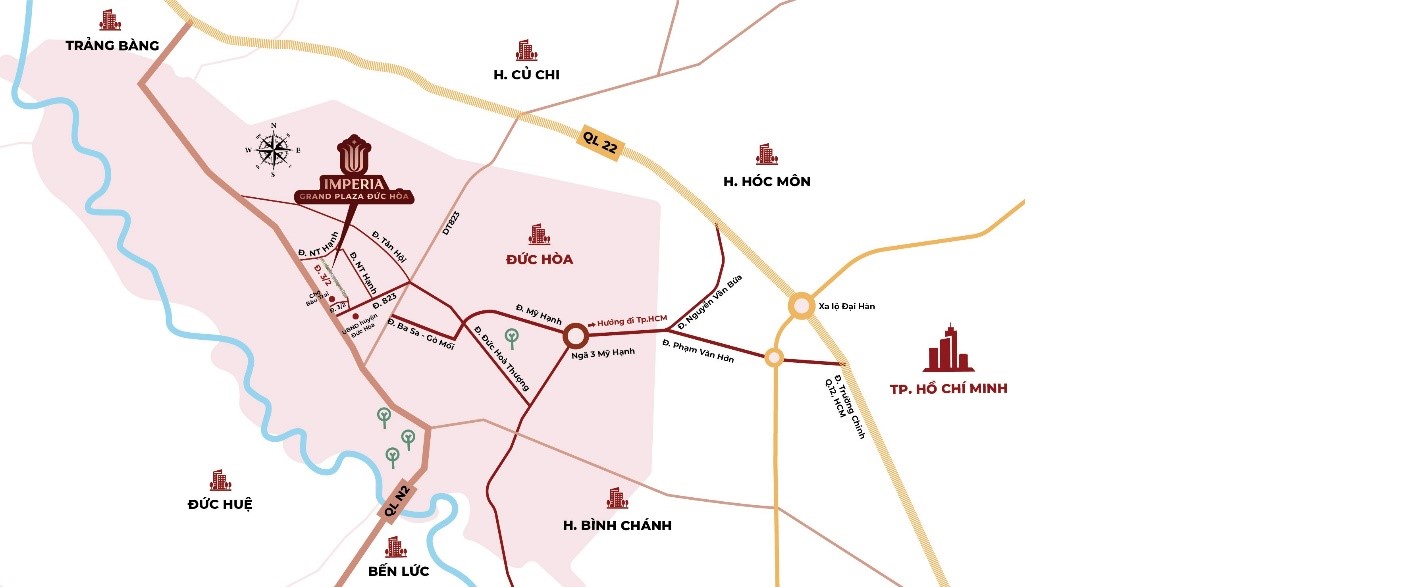 Nhờ các tuyến đường mạch máu này, từ Imperia Grand Plaza Đức Hòa chỉ mất khoảng 45 phút để di chuyển về trung tâm TP. Hồ Chí Minh. Song song đó, vị trí dự án cũng đóng vai trò đón đầu nhiều dự án phát triển hạ tầng liên kết vùng giữa TP.HCM với các thủ phủ công nghiệp phía Tây đang thành hình.