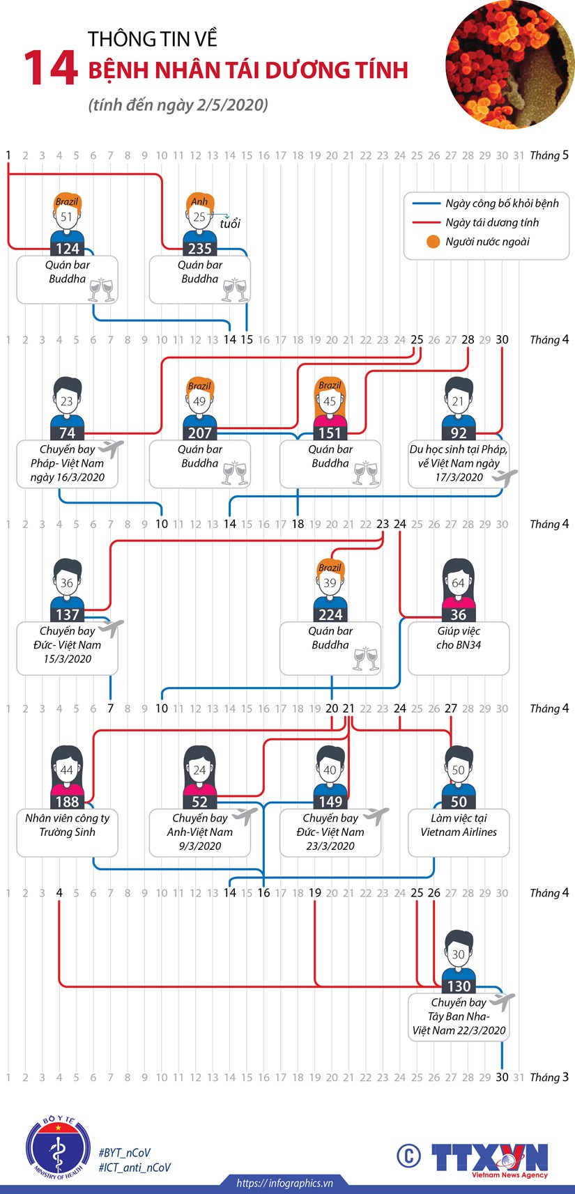 Theo tin từ Tiểu ban Điều trị Ban chỉ đạo Quốc gia phòng, chống COVID-19, tính đến 2/5, Việt Nam đã ghi nhận 14 ca tái dương tính sau khi được công bố khỏi bệnh.