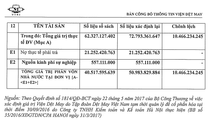 Theo quyết định số 1814/QĐ-BCT ngày 22 tháng 05 năm 2017 của Bộ Công thương về việc xác định giá trị Viện Dệt may do Tập đoàn Dệt May Việt Nam tạm thời quản lý để cổ phần hóa tại thời điểm 30/09/2016 do Công ty TNHH Kiểm toán và Kế toán Hà Nội thực hiện (Biên bản số 35/2016/XĐGTDN/CPA HANOI NGÀY 31/3/2017). Theo đó, tổng giá trị tài sản đang dùng của Viện dệt may tại thời điểm xác định giá trị doanh nghiệp 30/09/2016 là hơn 72,793 tỷ đồng. Trong đó nợ thực tế phải trả là 21,252 tỷ đồng. Như vậy, sau khi trừ đi khoản nợ phải trả thực tế tổng giá trị phần vốn góp nhà nước được xác định tại Viện dệt may chỉ còn hơn 50,9 tỷ đồng.