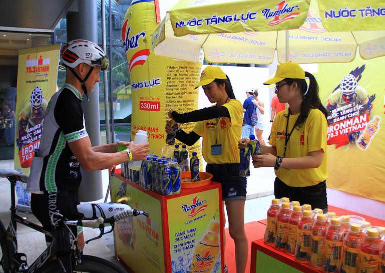 Các quầy tiếp nước của nhà tài trợ nước uống tăng lực Number 1 mở cửa để tiếp nước cho các Ironman luyện tập