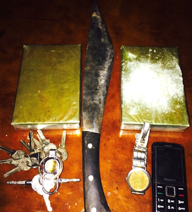 Khám xét tại chỗ, lực lượng chức năng thu giữ 2 bánh heroin, 1 khẩu súng kíp, dao nhọn, xe máy và nhiều tang vật khác.