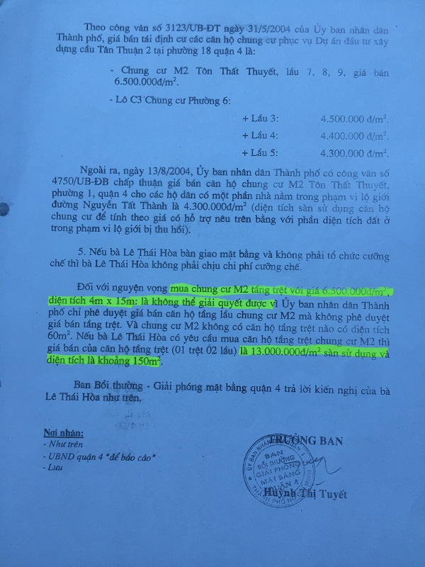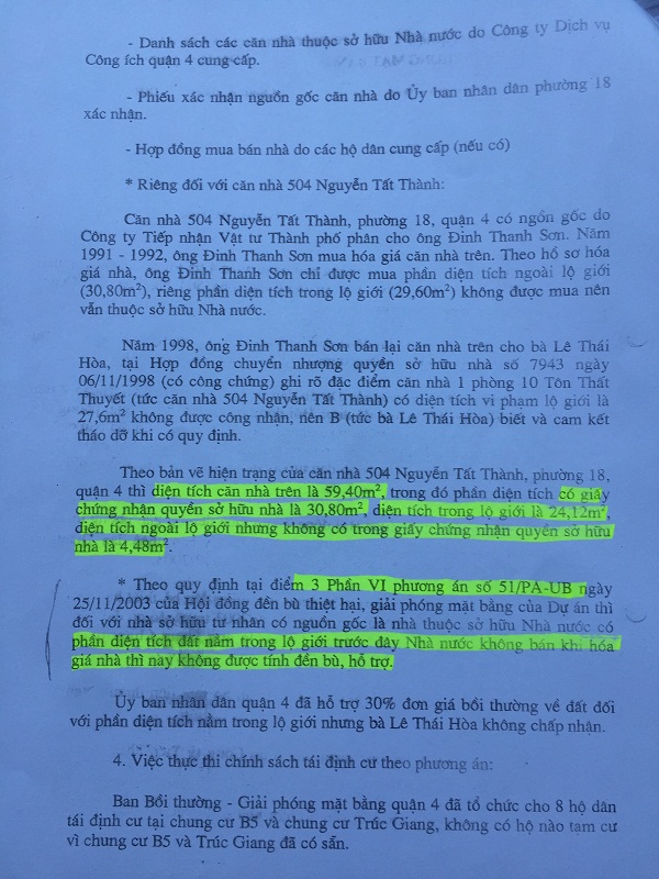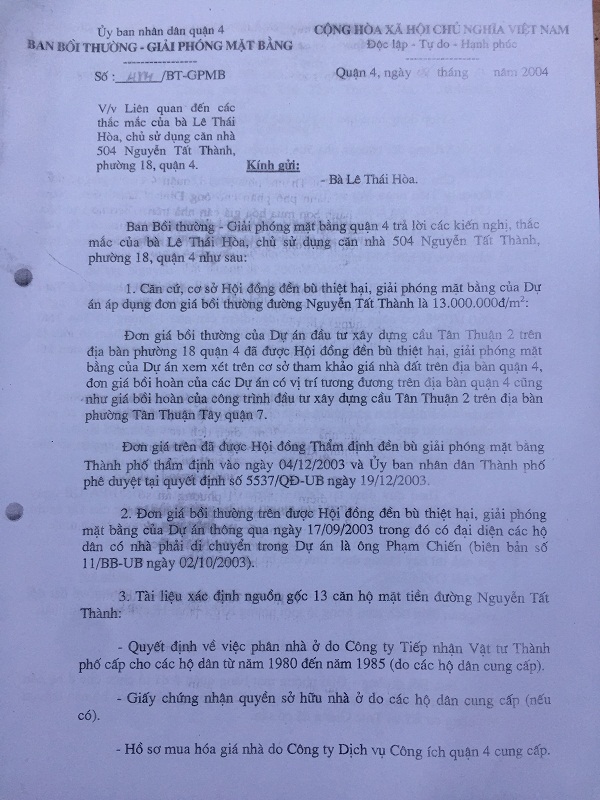 Không đồng ý với việc giải quyết bồi thường trên, bà Hòa đã làm đơn khiếu nại, đề nghị UBND quận 4, giải quyết các nội dung sau: