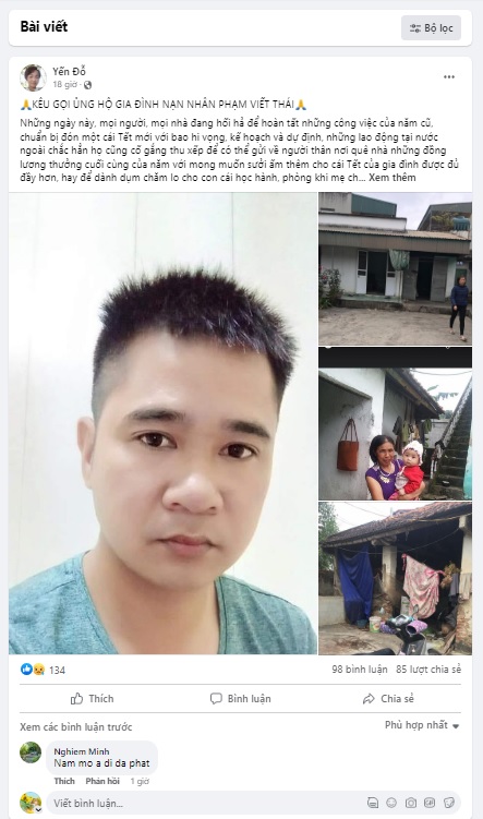 Trên facebook cá nhân, chị Đỗ Yến đã bày tỏ kêu gọi: "Từ tối ngày 11-01-2023 đến giờ, làng quê tôi bao phủ bởi những nỗi lòng thương cảm, xót xa cho một gia cảnh như vậy. Đó là anh Phạm Viết Thái (sinh năm 1985, quê ở Bình Giang, Hải Dương) đang là lao động xuất khẩu tại Đài Loan, nạn nhân trong một vụ tai nạn giao thông và đã vĩnh viễn ra đi nơi đất khách quê người...". Thông tin này đã nhận được nhiều sự quan tâm đồng cảm và chia sẻ của mọi người, cộng đồng mạng xã hội.