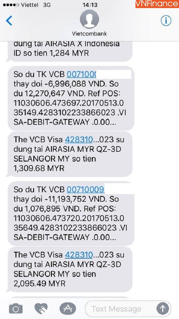 Trước đó, vào tháng 5/2017, một trường hợp khác là anh N.T.N (TP HCM) - chủ tài khoản số 00710009xxx cho biết vào sáng 13/5, khi ngủ dậy anh phát hiện tài khoản bị rút hơn 30 triệu đồng, phát sinh 7 giao dịch trong khoảng thời gian từ 3h42 - 5h34 sáng cùng ngày. Trong đó, 5 giao dịch thành công, hai giao dịch báo lỗi do hết tiền. Toàn bộ giao dịch đều là thanh toán vé máy bay mua từ website của hãng AirAsia tại các nước Myanmar, Indonesia, Singapore...