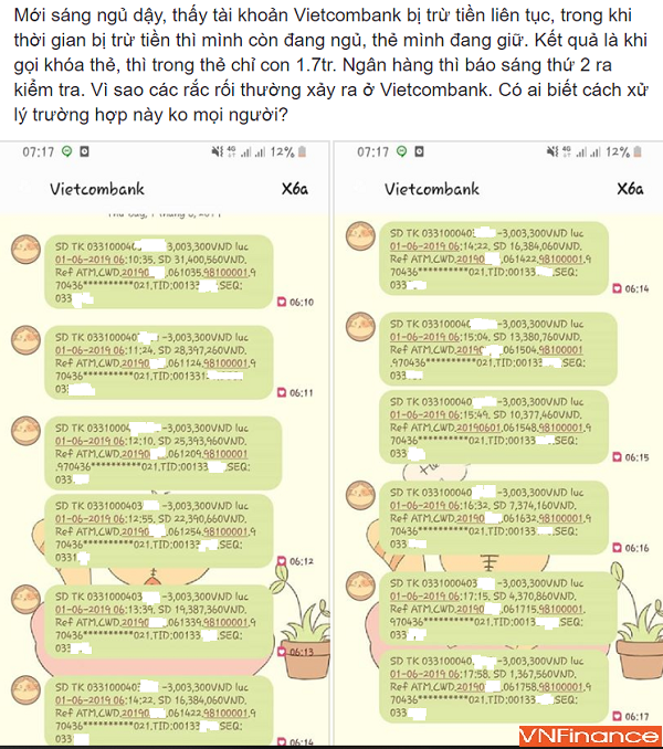 Hai khách hàng hoang mang khi số tiền trong thẻ ATM Vietcombank đồng loạt "ra đi" mặc dù thẻ vẫn trong ví chỉ sau một giấc ngủ. (Ảnh chụp màn hình).