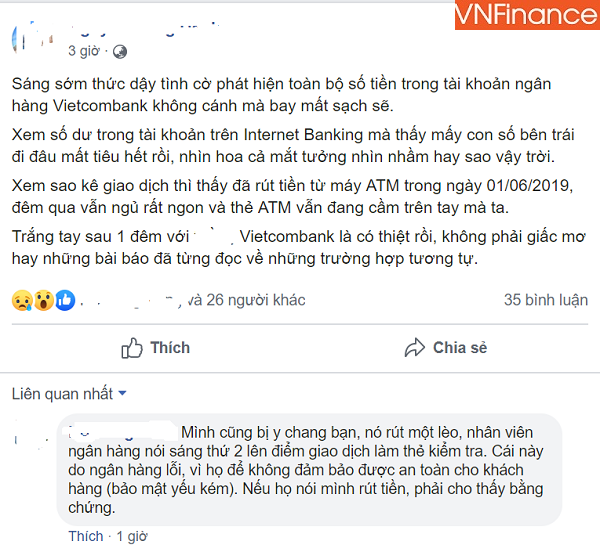 "Đêm qua vẫn ngủ rất ngon và thẻ ATM vẫn đang cầm trên tay mà ta. Trắng tay sau một đêm với Vietcombank là có thật rồi, không phải giấc mơ hay những bài báo đã từng đọc về những trường hợp tương tự". Anh N.C.D cho biết.