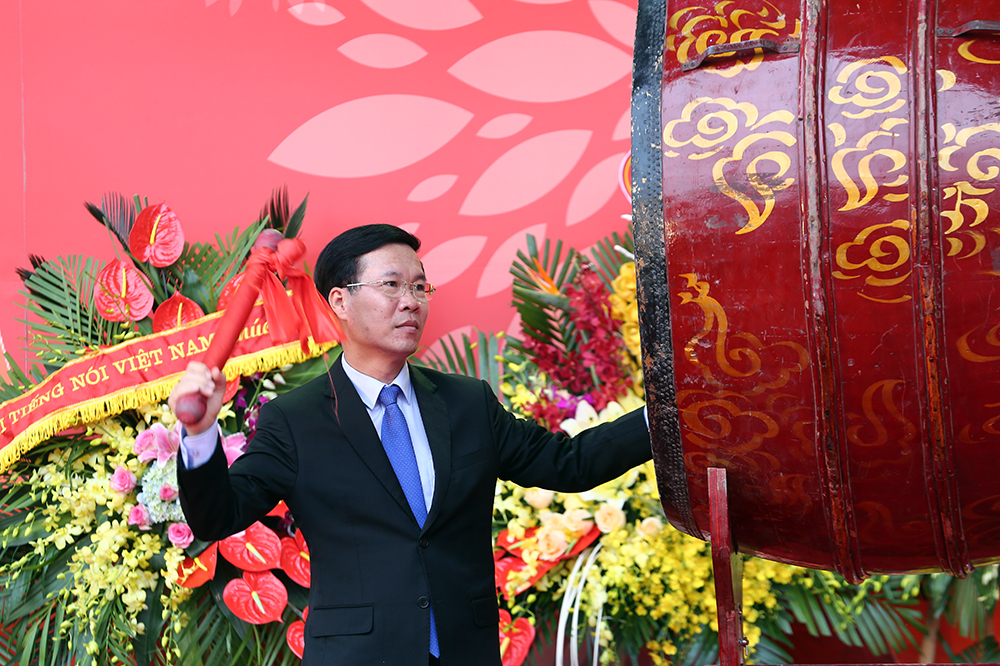 Tại lễ khai mạc, đồng chí Võ Văn Thưởng trực tiếp đánh trống khai Hội Báo toàn quốc 2018.