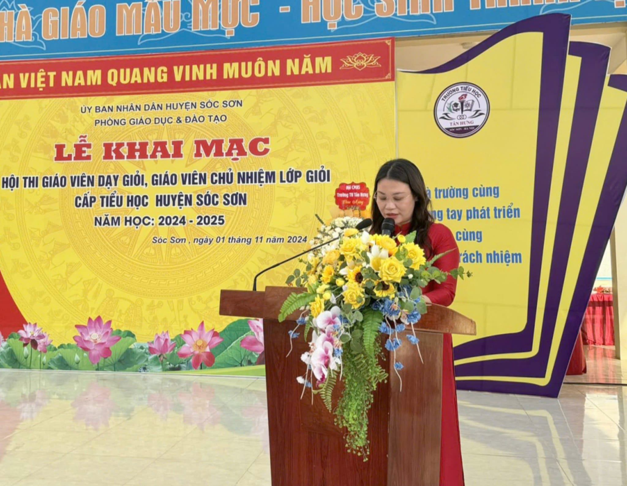Bà Trần Thị Thanh Huế (Trưởng phòng GD&ĐT huyện Sóc Sơn, Trưởng Ban Tổ chức hội thi) phát biểu trong buổi khai mạc hội thi giáo viên dạy giỏi, giáo viên chủ nhiệm lớp giỏi cấp tiểu học.