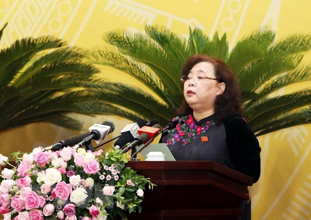 | Chủ tịch Hội đồng Nhân dân thành phố Hà Nội Nguyễn Thị Bích Ngọc phát biểu khai mạc kỳ họp. (Ảnh: Lâm Khánh/TTXVN) |
