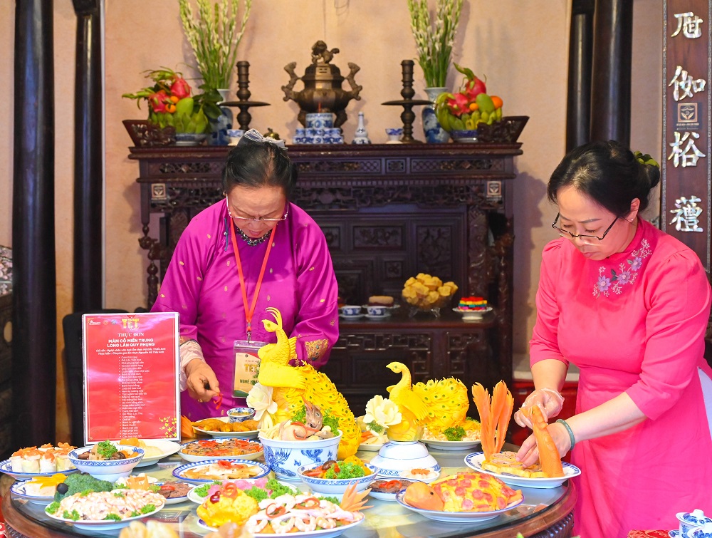 Các nghệ nhân chuẩn bị mâm cỗ truyền thống ngày Tết miền Trung với chủ đề "Long Lân Quy Phụng".