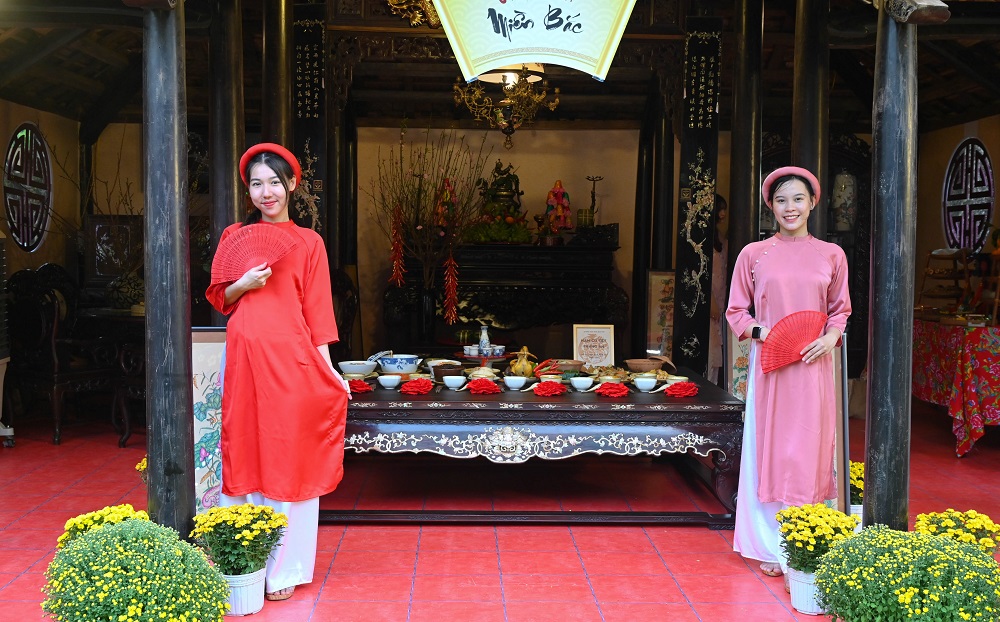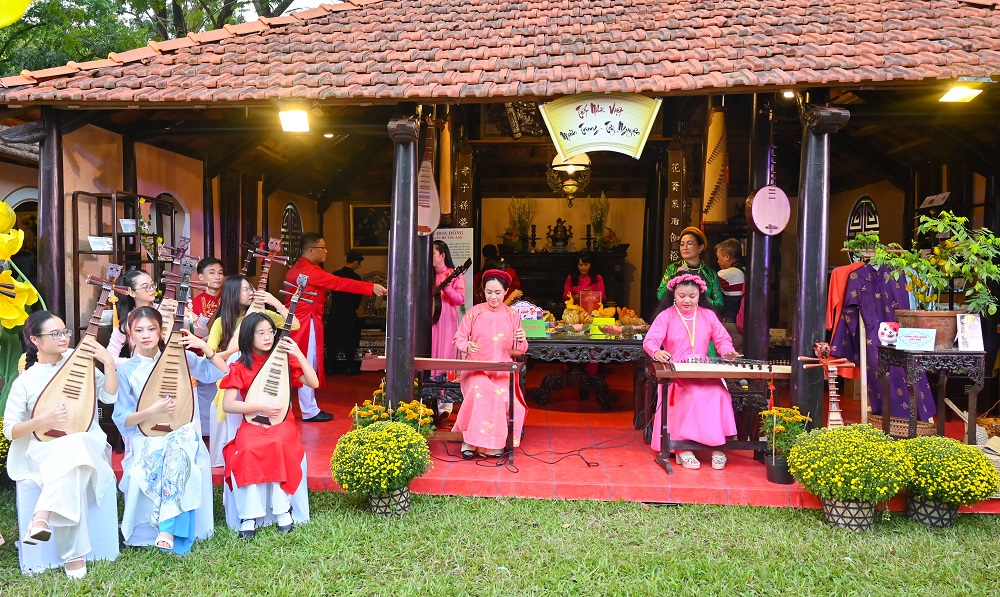 Không gian biểu diễn nhạc cụ cổ truyền gắn liền với không gian bày trí mâm cỗ ngày Tết.
