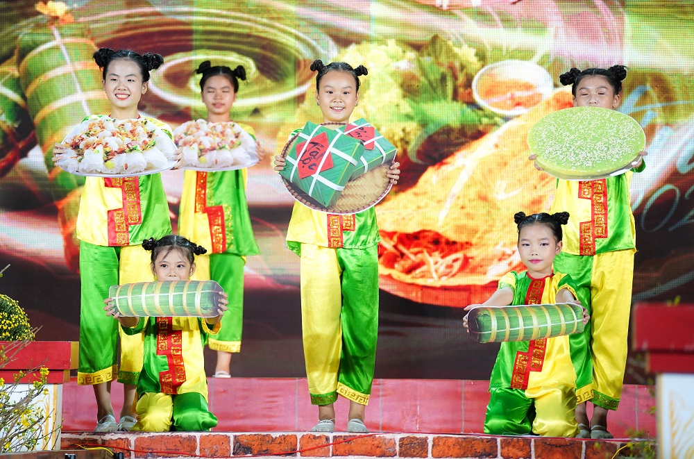 Những hình ảnh quen thuộc về văn hóa ẩm thực ngày tết cổ truyền dân tộc được các ca sĩ, diễn viên nhí tái hiện qua các tiết mục âm nhạc.