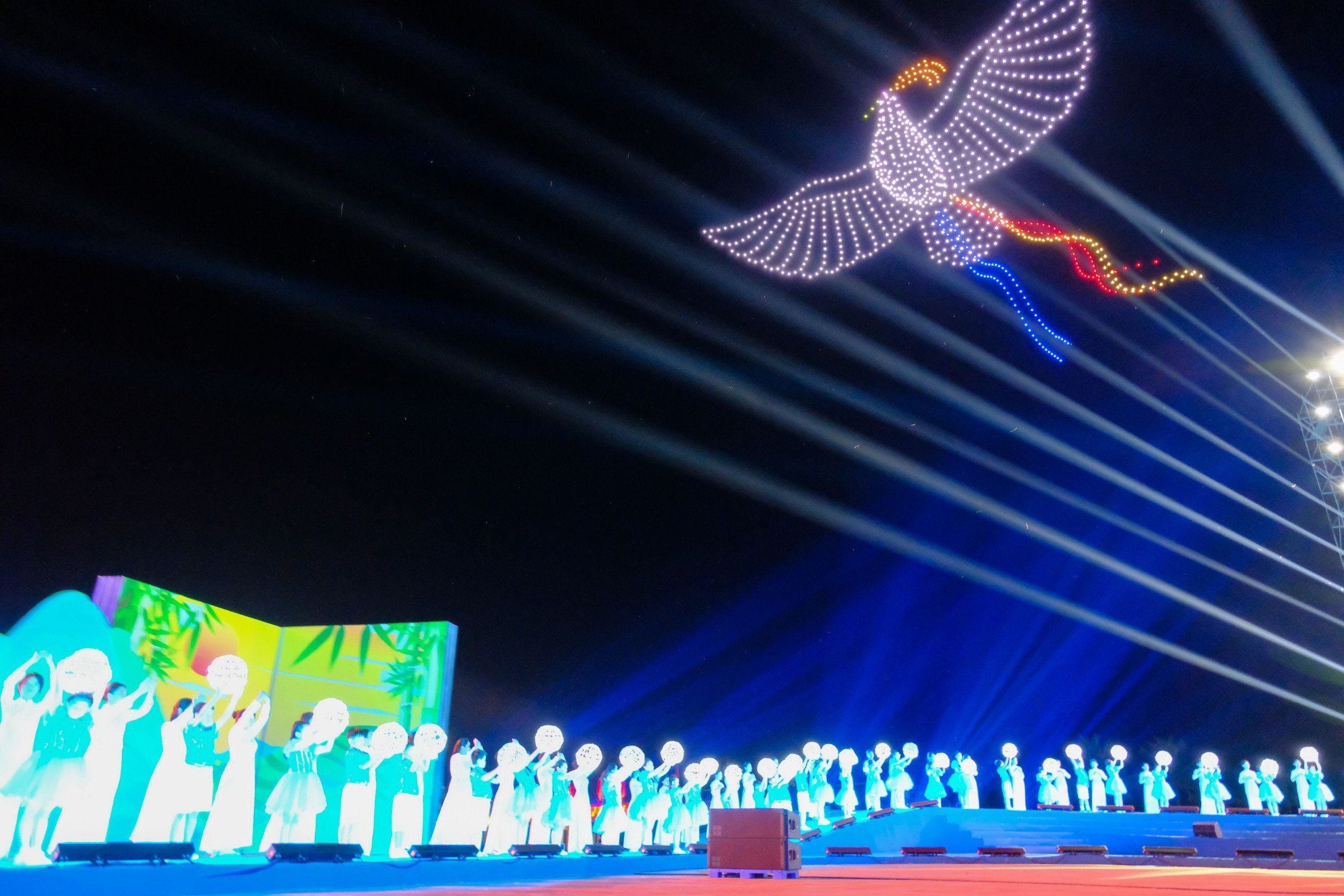 Hình ảnh chiếc Chuông Hòa bình được drone light tạo hình trên cao tạo ấn tượng đặc biệt trong chương trình nghệ thuật khai mạc Lễ hội Vì Hòa bình