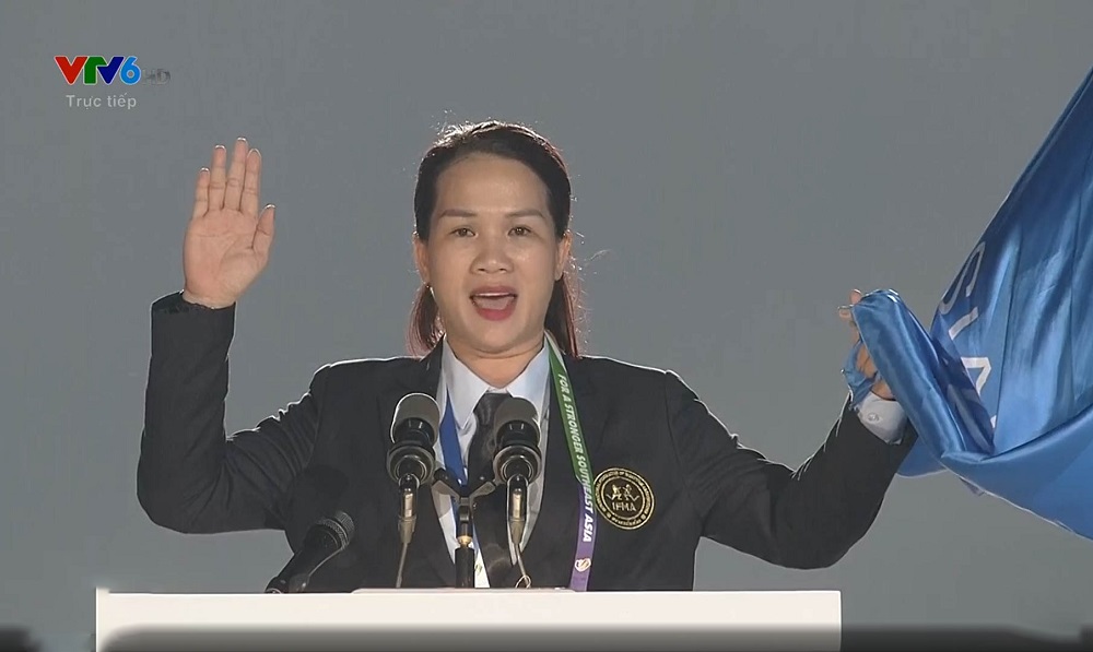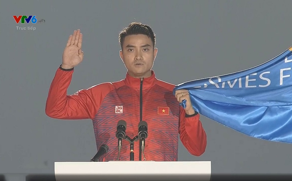 Vận động viên Vũ Thành An (ảnh trên) và trọng tài Phan Thị Ngọc Linh đại diện cho các vận động viên, trọng tài tham dự SEA Games thực hiện nghi thức tuyên thệ tại lễ khai mạc.