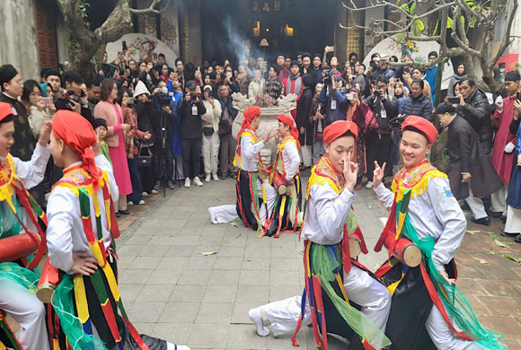 Tiết mục múa văn nghệ "Con đĩ đánh bồng" do các chàng trai làng Triều Khúc, xã Tân Triều, huyện Thanh Trì, thành phố Hà Nội thực hiện