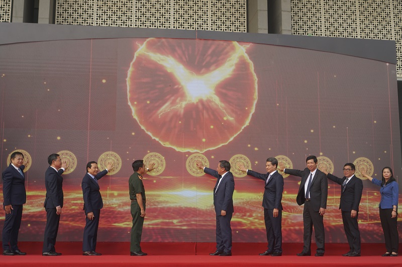 Các cán bộ, đại biểu thực hiện nghi thức chạm tay trên màn hình LED khai mạc triển lãm.