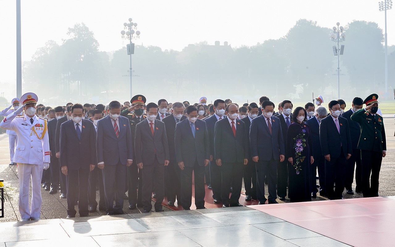 Các đồng chí Lãnh đạo Đảng, Nhà nước, Chính phủ, Quốc hội, Mặt trận Tổ quốc Việt Nam và các đại biểu Quốc hội tới đặt vòng hoa và vào Lăng viếng Chủ tịch Hồ Chí Minh - Ảnh: Quochoi.vn