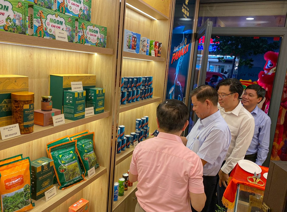 Khách hàng tham quan, tìm hiểu các sản phẩm từ Sâm Ngọc Linh được trưng bày tại Showroom.