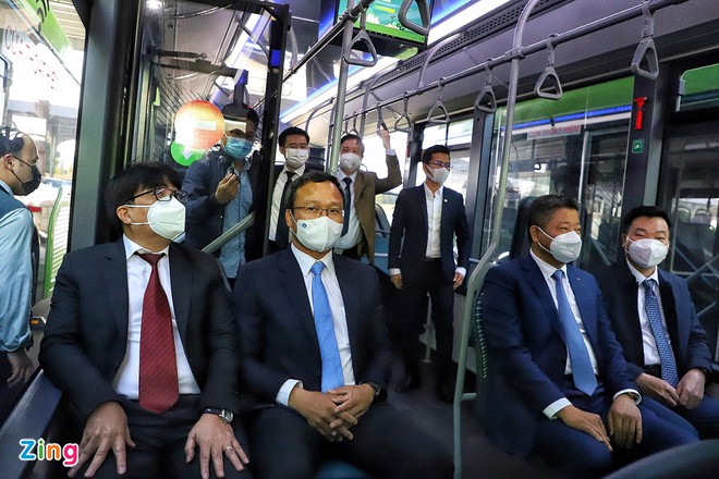 Lãnh đạo Ủy ban An toàn giao thông Quốc gia, Bộ GTVT, UBND Hà Nội trải nghiệm trên chuyến buýt điện đầu tiên của Việt Nam. (Ảnh: Zing)