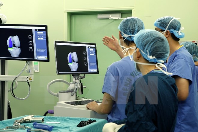 | Cán bộ y tế hội chẩn kết quả chụp CT khớp gối của bệnh nhân tại Bệnh viện Bạch Mai. (Ảnh: Dương Ngọc/TTXVN) |