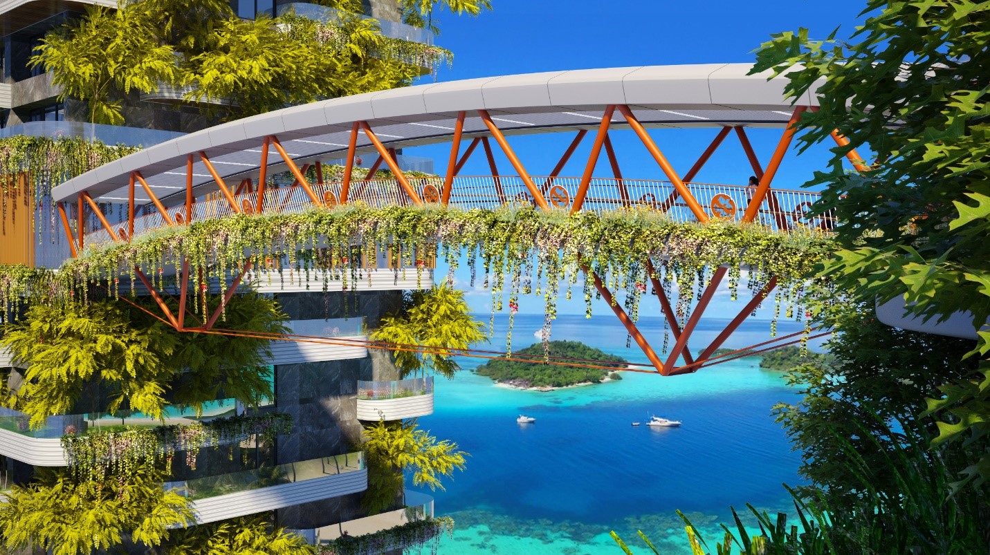 Cầu Mây nối giữa 3 tòa vừa là biểu tượng của sự gắn kết thịnh vượng, vừa là nơi tận hưởng đẹp nhất quần thể sinh quyển của Thế giới.