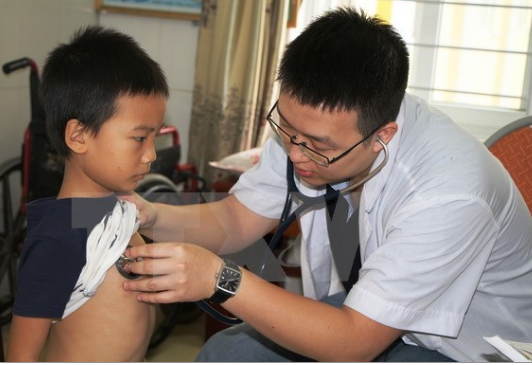 | Bác sỹ Bệnh viện Việt Đức khám sàng lọc bệnh tim cho trẻ dưới 16 tuổi. (Ảnh: Hoàng Ngà/TTXVN) |
