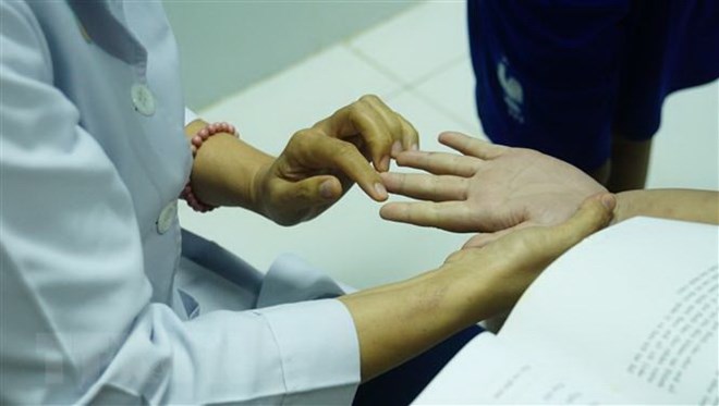 | Khám bệnh cho trẻ em có dấu hiệu mắc bệnh tay chân miệng. (Ảnh: Đinh Hằng/TTXVN) |