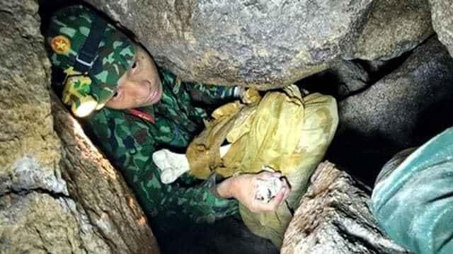 Tổ công tác của BCHQS tỉnh Khánh Hòa luồn sâu trong hang đá để bốc hài cốt liệt sĩ