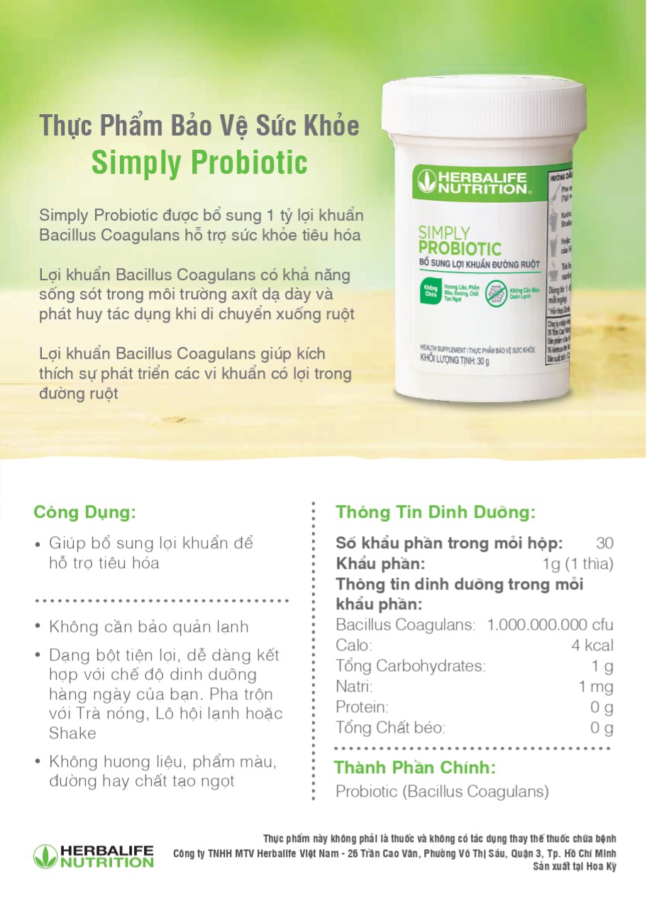 Thông tin dinh dưỡng và công dụng của Thực phẩm bảo vệ sức khoẻ Simply Probiotic.