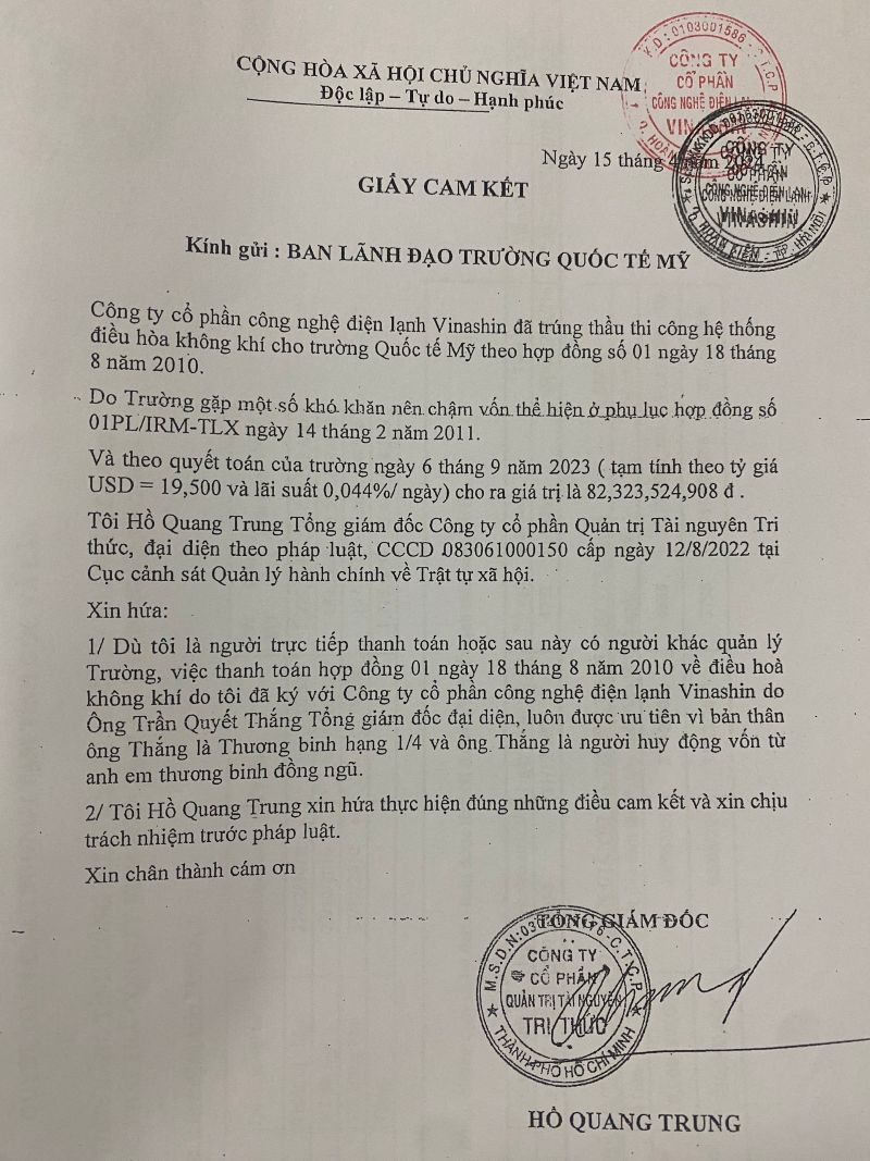 Giấy cam kết của ông Hồ Quang Trung- Tổng giám đốc của Công ty CP Quản trị Tài nguyên Tri thức gửi Ban lãnh đạo trường Quốc tế Mỹ